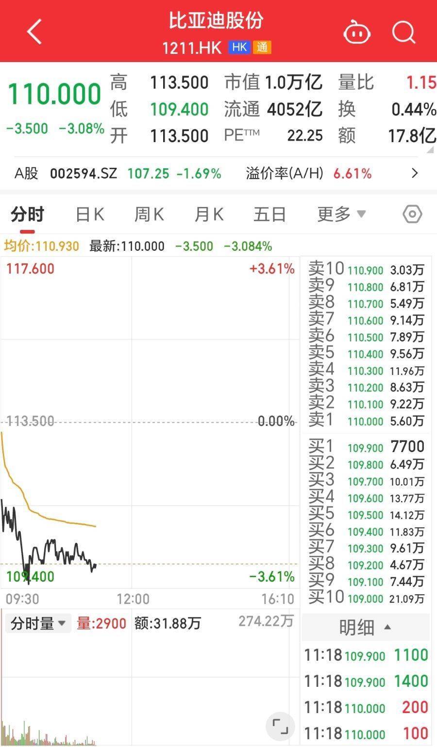9月22日,比亚迪股份(01211.HK)低开,截至11点18分,报110港元/股,跌超3%。消息面上,“巴菲特清仓比亚迪”话题登上微博热搜腾思控股,引发广泛关注。