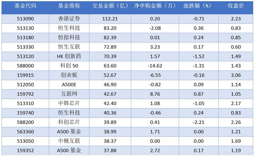 从成交金额上来看,2025年09月19日成交额最大的是香港证券(513090),交易金额112.21亿元。排名靠前的恒生科技(513130)、恒指科技(513180)、恒生互联(513330),成交额分别为83.20亿元、82.39亿元、72.89亿元。