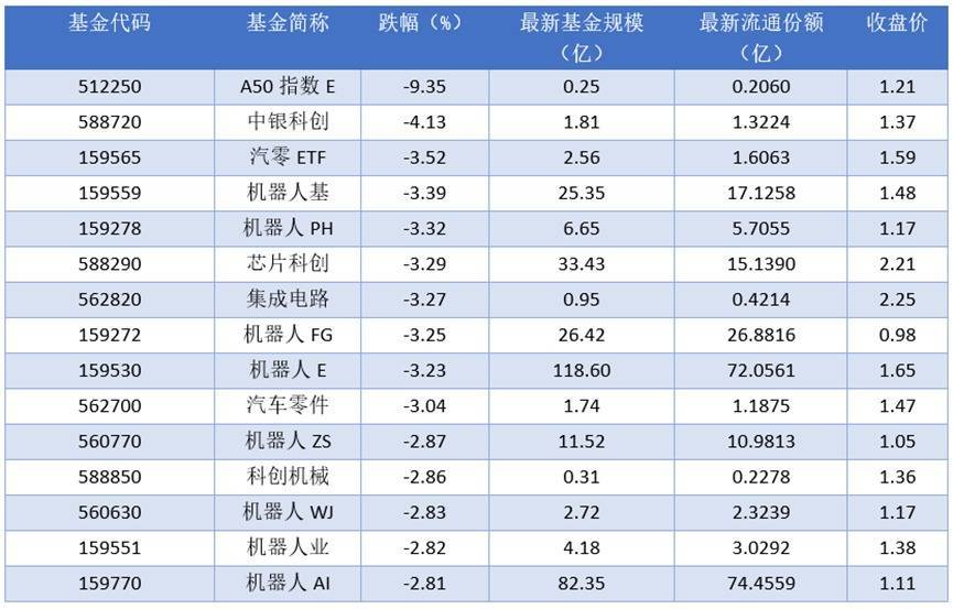 下跌方面,2025年09月19日跌幅最大的是A50指数E(512250),跌幅达到9.35%。排名靠前的中银科创(588720)、汽零ETF(159565)、机器人基(159559),跌幅分别为4.13%、3.52%、3.39%。