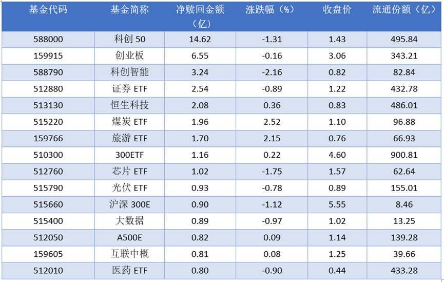 资金流出方面,2025年09月19日净赎回金额最多的是科创50 (588000),赎回金额14.62亿元。排名靠前的创业板(159915)、科创智能(588790)、证券ETF (512880),赎回金额分别为6.55亿元、3.24亿元、2.54亿元。