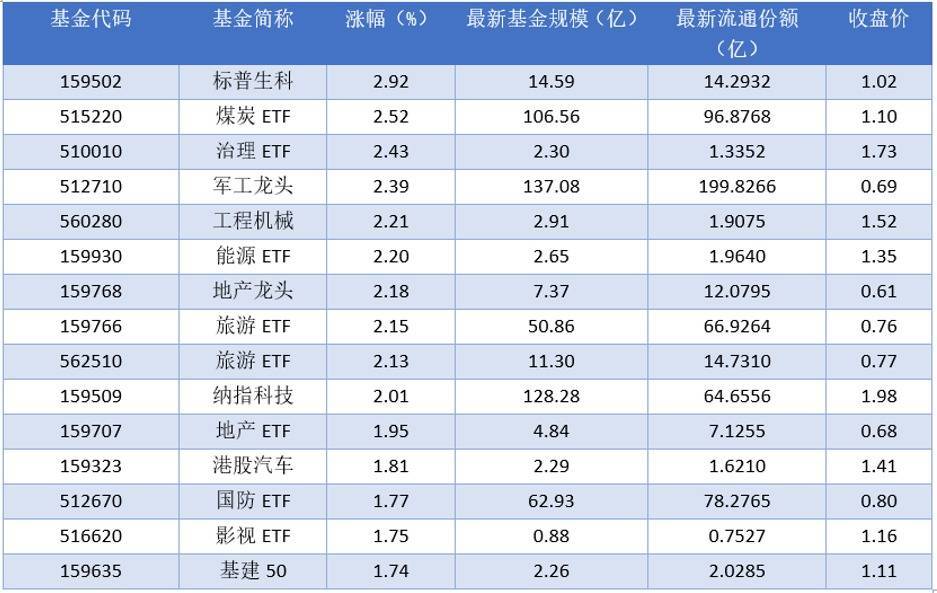 根据巨灵财经统计的数据显示,2025年09月19日场内ETF基金中标普生科(159502)领涨,涨幅为2.92%,排名靠前的煤炭ETF (515220)、治理ETF (510010)、军工龙头(512710),涨幅分别为2.52%、2.43%、2.39%。