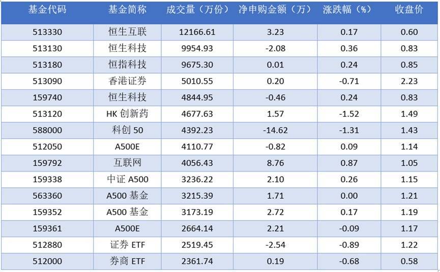 从成交量上来看,2025年09月19日成交量最大的是恒生互联(513330),成交量为12166.61万份。排名靠前的恒生科技(513130)、恒指科技(513180)、香港证券(513090),成交量分别为9954.93万份、9675.30万份、5010.55万份。