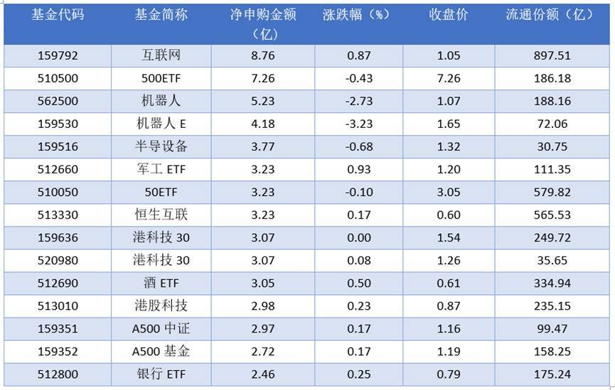 细分到资金流动情况上来看,2025年09月19日净申购金额最大的为互联网(159792),当日净申购金额为8.76亿元。排名靠前的500ETF (510500)、机器人(562500)、机器人E(159530),申购金额为7.26亿元、5.23亿元、4.18亿元。